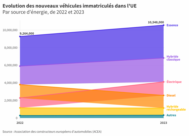 La nouveauté. Si l'achat de voitures à essence neuves ne faiblit pas (+10,6 %), les moteurs de cette hausse européenne restent les hybrides classiques (+29,5 %) et les électriques (+37 %). Bien qu'elles ne représentent que 9,1 % des ventes, ces dernières ont dépassé pour la première fois les véhicules diesel. Une tendance aidée par la fin de la pénurie post-Covid de pièces électroniques.