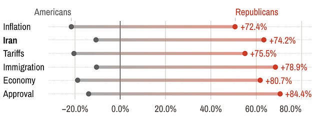 In early 2016, presidential candidate Donald Trump said, “Inlike other candidates for the presidency, war and aggression will not be my first instinct.” He mused that invading Iraq “may have been the worst decision” in presidential history and said that Hillary Clinton had bad judgment. “Look at the war in Iraq, if you look at what she did with Libya, which was a total catastrophe.”¹ This dovish rhetoric put Trump at odds with members of the more hawkish Republican establishment like Marco Rubio and Jeb Bush. Fast forward eight years, and Trump once again ran against “forever wars” and sending American soldiers to fight abroad in 2024. But those were no longer fringe positions in the GOP. A meaningful share of the Republican establishment was fully behind MAGA-style isolationism. JD Vance — somewhat of a standard-bearer on the anti-interventionist right — was Trump’s VP pick. On the media side of things, Tucker Carlson and Nick Fuentes spoke to different parts of the Republican base about the dangers of foreign entanglement, as did prominent members of Congress like Marjorie Taylor Greene. Of course, there’s still a more hawkish contingent of Republican elites. But that didn’t stop the Trump campaign from running with an anti-war message. Compared to something like immigration, the party is well and truly split on the value of international military action. Trump, who is much less ideologically consistent than the true interventionist or anti-interventionist members of the GOP, has the final say in these disputes at the moment. He’s so far swung toward the Rubio side of the party during his second term, capturing Venezuelan president Nicolás Maduro and most recently starting a war with Iran. So how has each wing of the Republican Party reacted to our latest international foray? Here’s Sen. Lindsey Graham for the hawks: “The end of the largest state sponsor of terrorism is upon us. God bless President Trump, our military and our allies in Israel.” He’s not alone. There are increasing signals that Republican donors prefer Rubio to Vance in 2028, which means that Nate might get to look smart for picking Rubio in our recent 2028 Republican primary “draft”.² But Carlson called the Iran strikes “absolutely disgusting and evil.” Fuentes has gone even further, encouraging his followers to boycott the 2026 midterms or even vote Democrat in response to Iran and other issues. Joe Rogan has referred to the Iran War as “insane”.³ “I mean, this is why a lot of people feel betrayed, right? He ran on no more wars and these stupid senseless wars, and then we have one that we can’t even really clearly define why we did it,” he recently said. It’s been a busy news cycle, but Silver Bulletin is working hard to cover as much of it as we can. To receive new posts and support our work, please consider becoming a subscriber. So far, MAGA voters remain highly loyal to TrumpSo if there’s ever going to be an issue that causes a meaningful number of Republican voters to break with Trump, Iran seems like a top candidate. (Plus, the increase in gas prices has so far been slightly higher in red states like Florida.) It’s easy enough to imagine a world where the more isolationist members of Trump’s MAGA base oppose the foreign military action, while it’s supported by older, more traditional members of the GOP. That would be a reversal from the usual way things break for Trump — for example, on an issue like tariffs. To level-set, the war in Iran is not popular with Americans in general. Support for the strikes and approval of Trump’s approach to Iran are underwater in nearly every poll conducted since the start of the war, and the Iran War is less popular than other foreign conflicts were at their outset.⁴ To put some numbers to that, we averaged every Iran poll conducted since February 27. The war is opposed by 50 percent of Americans and supported by 40 percent.⁵ It’s a different story for Republicans, 77 percent of whom support the war, on average. But that’s exactly what we’d expect for almost any Trump policy. Take the Venezuela strikes: Republicans were always more supportive of that operation than Democrats or independents. And Republican support only increased over time, especially after Maduro was captured. (That’s not inherently a dig at Republicans; Democrats also tend to overwhelmingly approve of the actions of Democratic presidents.) The real question is whether you see more Republican defections on Iran than you do on other salient topics that don’t touch on the isolationism question. To answer that, let’s compare Republican approval of the Iran War to some crosstab averages of Trump’s approval on salient issues like immigration and inflation, plus his overall job approval rating.⁶ The war with Iran is popular among Republicans Approval of military action in Iran or Trump's handling of Iran, compared to Trump's job approval rating and issue approval ratings, separately for all Americans and Republicans At first glance, there’s not much evidence of a larger-than-average split in the GOP. The share of Republicans who disapprove of the Iran War (13 percent) is on the low end compared to issues like tariffs (20 percent) and inflation (22 percent). However, the share of Republicans who approve of the Iran War is also lower than Trump’s approval rating on the economy and immigration. That’s partially because more voters answer “don’t know” or “no opinion” on questions about Iran — which is pretty resonable for such a recent event. To avoid that problem, we can look at Republicans’ net approval of these issues. It’s also worth comparing those numbers to Trump’s net approval rating among all Americans. If Iran is causing a larger-than-average break among Republican voters, the gap between Republican support for the war and support among all Americans should be smaller than expected. On average, Trum